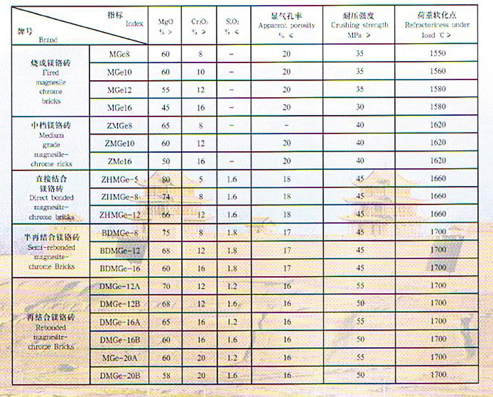 鎂鉻磚:是以燒結(jié)鎂砂和氧化鉻為原料經(jīng)高壓成型、高溫?zé)芍频,具有熱膨脹系?shù)小、抗熱震性能好,抗渣性強(qiáng)等特點(diǎn),廣泛用于水泥窯、有色冶金爐、玻璃窯蓄熱室等各種工業(yè)窯爐。